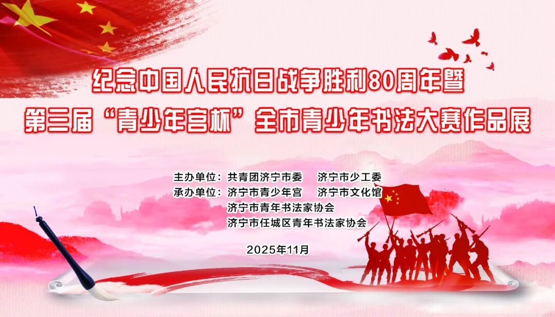 今年是中国人民抗日战争暨世界反法西斯战争胜利80周年。为铭记历史、缅怀先烈,弘扬伟大的抗战精神,展现中华书法艺术魅力,第三届“青少年宫杯”全市青少年书法大赛作品展今天在我馆开幕。本次大赛由共青团济宁市委、济宁市少工委主办,济宁市青少年宫、济宁市文化馆、济宁市青年书法家协会、任城区青年书法家协会共同承办?;疃?月23日启动,截至9月31日,本次大赛共收到来自全市青少年书法作品4348件,涵盖楷书、行书、隶书、篆书、草书等多种书体,充分展现了我市青少年书法教育的普及成果。经过评委团专业评审,最终740幅作品脱颖而出,其中获奖作品40件(软笔20件,硬笔20件)、入展作品166件(软笔83件,硬笔83件)、入选作品534个(软笔244件,硬笔290件),评选出优秀组织奖33个。作品创作题材突出铭记历史,缅怀先烈,弘扬伟大抗战精神主题,或讴歌祖国山河,或书写经典诗词,笔里间洋溢着青春气息与文化自信,既传承经典笔墨神韵,又融入当代审美意趣,或意趣通达、温文细腻,或厚拙苍劲、恣肆跌宕,全面展现了当代书法艺术的多元风貌,体现了“书画歌盛世,翰墨播和谐的时代精神。